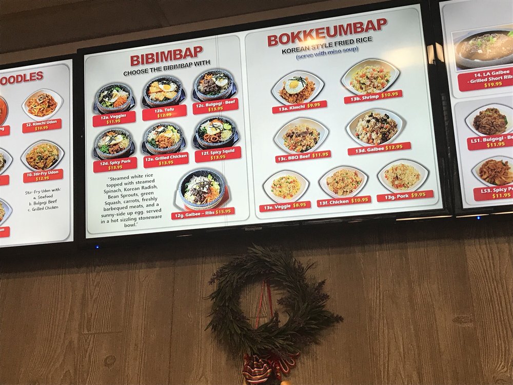 Steamed white rice topped with freshly grilled bulgogi beef, steamed spinach, Korean radish, bean sprouts, green squash, carrots, and a sunny-side-up egg. Served in a hot sizzling stoneware bowl. Comes with side of miso soup.