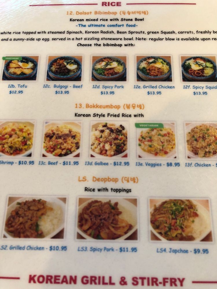 Steamed white rice topped with freshly cooked tofu, steamed spinach, Korean radish, bean sprouts, green squash, carrots, and a sunny-side-up egg. Served in a hot sizzling stoneware bowl. Comes with side of miso soup.